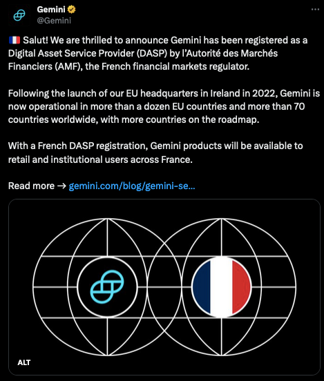 Cryptocurrency exchange Gemini has been granted registration in France by the Autorité des Marchés Financiers. The approval means Gemini can operate in France as a digital asset service provider (DASP). In the announcement, Gemini said that there will be over 70 cryptocurrencies available over the coming weeks. This follows Coinbase and Circle, who registered in December 2023.
