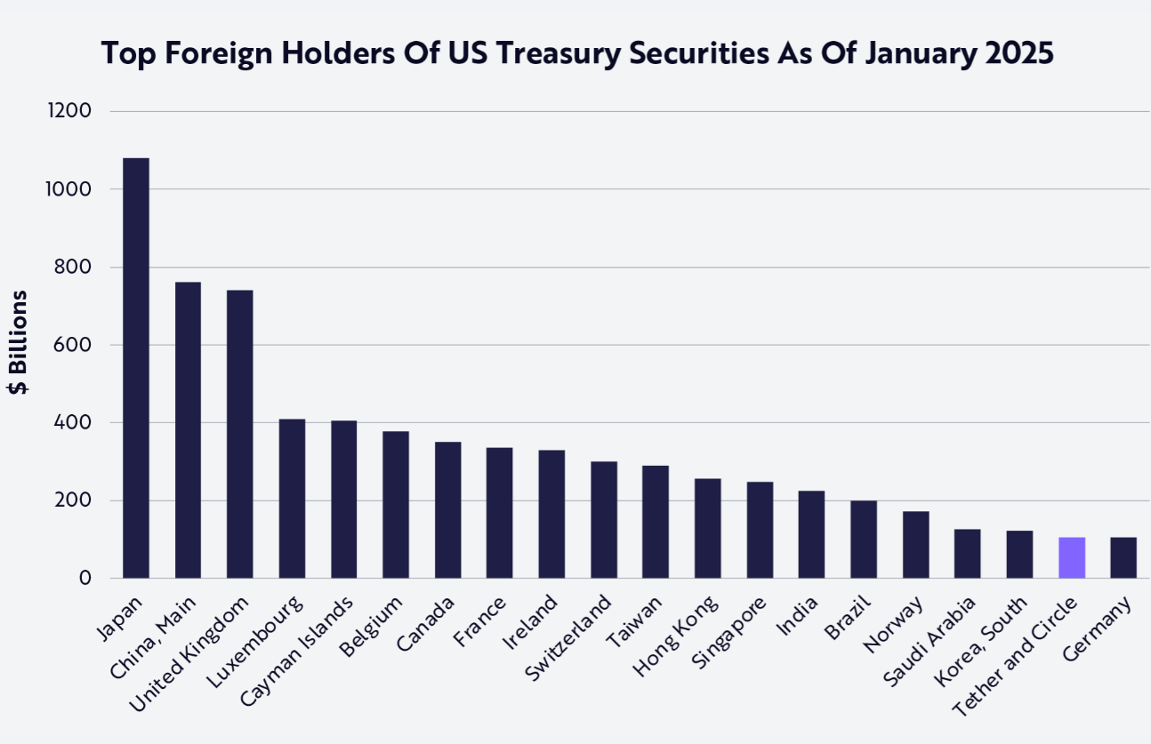 This reserve model has made Tether alone billions in profits, even as it creates a stable bid for U.S. debt at the short end of the curve—a new structural force that financial markets cannot ignore. As of January 2025, Tether (USDT) and Circle (USDC) together were #19 among the top 20 foreign holders.