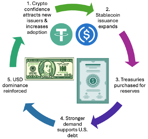 The result is a reinforcing cycle: stablecoin adoption drives Treasury demand, Treasury demand reinforces U.S. fiscal strength and dollar primacy, and that primacy attracts even more adoption.