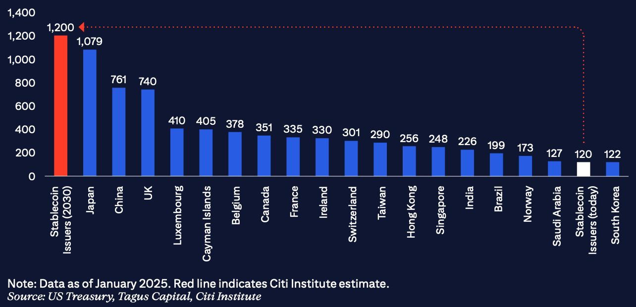 Despite these risks, the momentum is in the direction of long-term growth. Stablecoins are evolving from a crypto novelty into institutional-grade, dollar-exporting infrastructure. They represent the market’s answer to the debate over a central bank digital currency: a privately issued, regulated, and dollar-backed digital money system that extends U.S. financial reach across borders. Forbes projects stable coin issuers could surpass all countries, including Japan and China, by 2030.