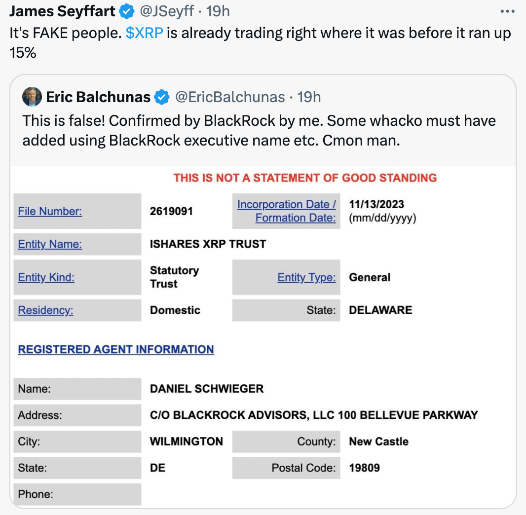 In other Blackrock news, false reports of an application for a Blackrock XRP Trust spread on X on November 13th. The rumours circulated as a result of an application that appeared on the Delaware state website under Blackrockās name. However, the submission was false and Blackrock confirmed they had not submitted it. As a result, XRP spiked 13% before falling back to the original price.