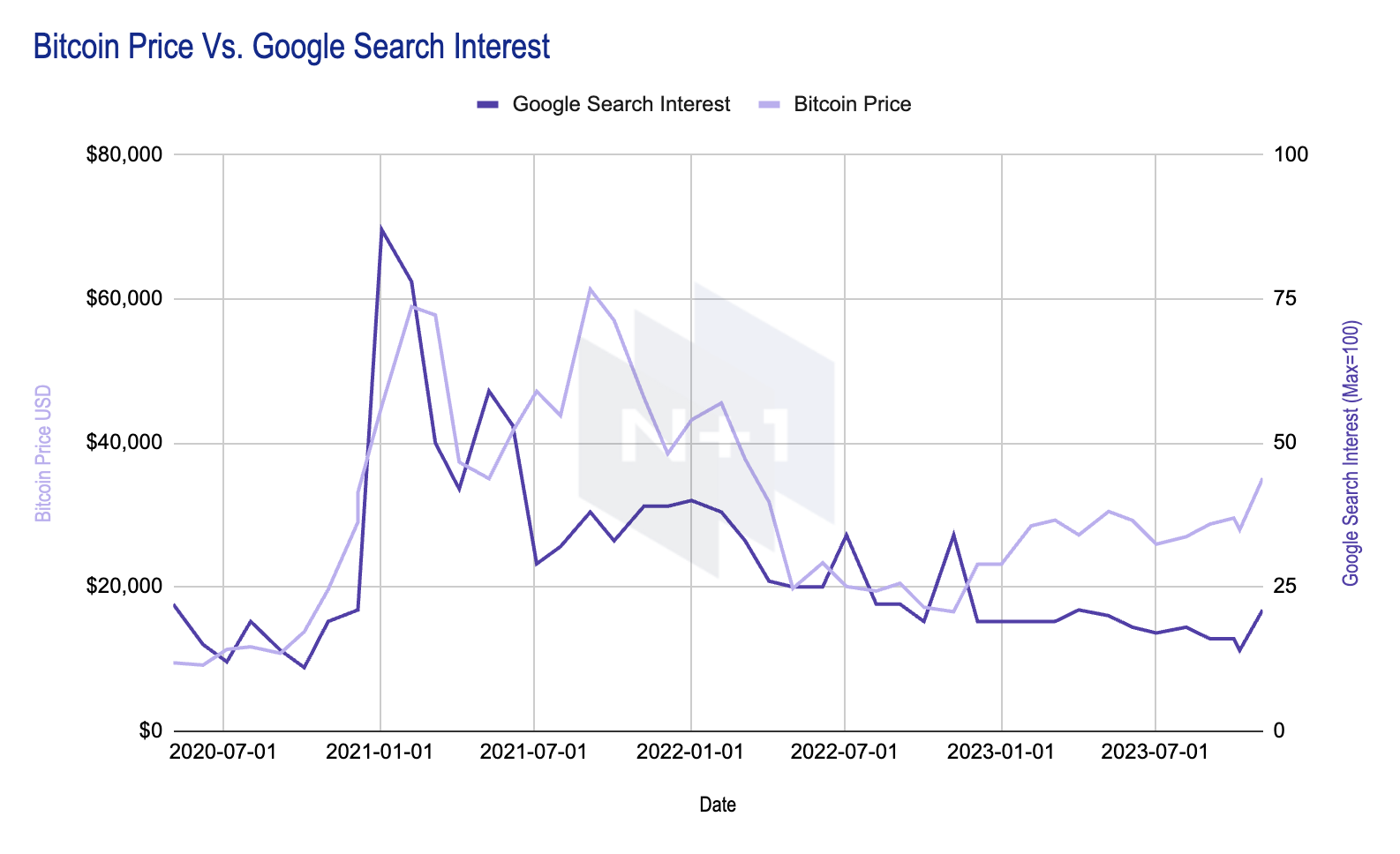 Google Trends - Measures the relative volume of Google searches over time. Google Trends shows the number of searches for a particular topic on Google’s search engine. We theorize that when these searches are increasing it reflects a rise in interest in coins or crypto developments and may be positively correlated with crypto prices. Moreover, crypto prices may have a negative correlation to searches as they peak or decline to extreme levels. This reflects situations of very high market exuberance or lack of interest which we might see at crypto market tops or bottoms. For example, the 2017 Bitcoin search peak of 100% gives a baseline for attention levels. Search quantities below this 2017 peak are potentially under attended or fairly attended periods.