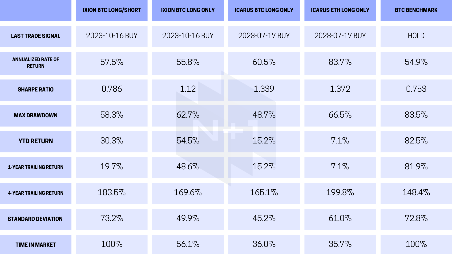 - Ixion BTC Long Only and Icarus BTC Long Only buys and holds BTC or sells BTC into a cash position.