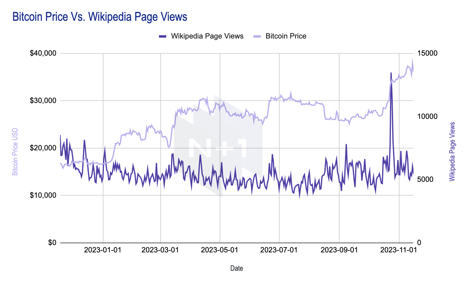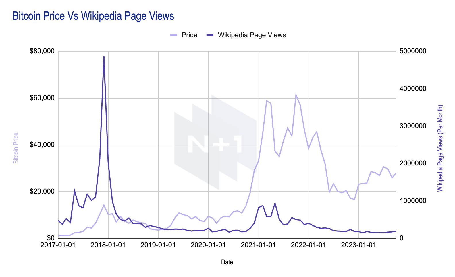 Wikipedia Page Views - Similar to Google trends, Wikipedia page views proxy the level of attention in the crypto market. Wikipedia page views typically indicate interest in topics and ideas. These page views may represent a desire to attain more detailed and specific knowledge in the crypto space. Moreover page views may show a more intense and serious interest in a topic compared to a Google search.