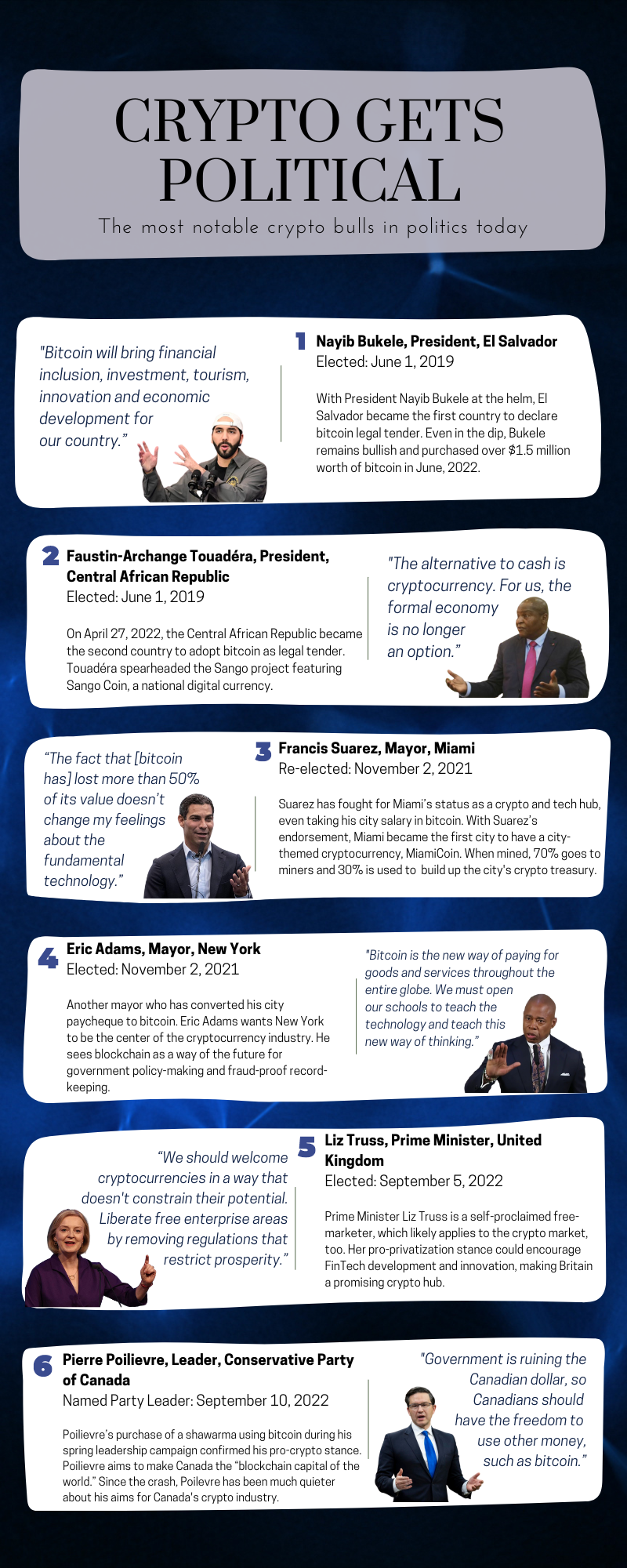 Within the past few years, crypto transaction volumes have soared as retail investors clamored for crypto, followed quickly by major institutions. Crypto’s economic and cultural impact has become too big to ignore, especially for politicians. Questions of governance and regulation have hit the desks of political leaders who are tasked with creating a regulatory framework for a novel and disruptive sector. While many politicians remain cautious about the sector, others are unabashedly bullish on bitcoin, highlighting crypto as central to their platform.