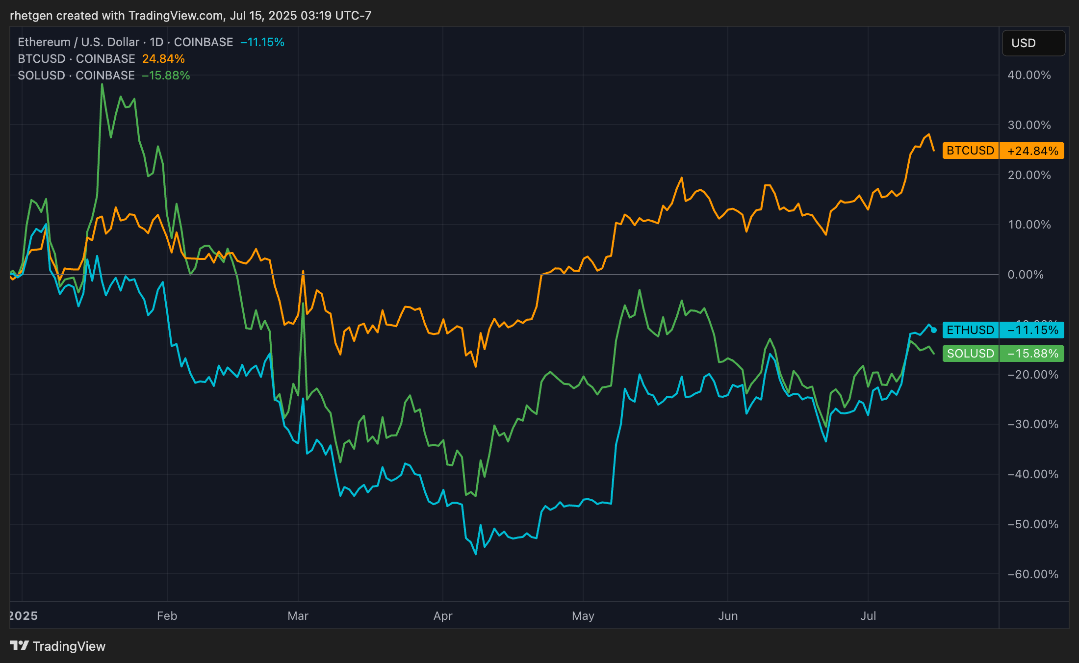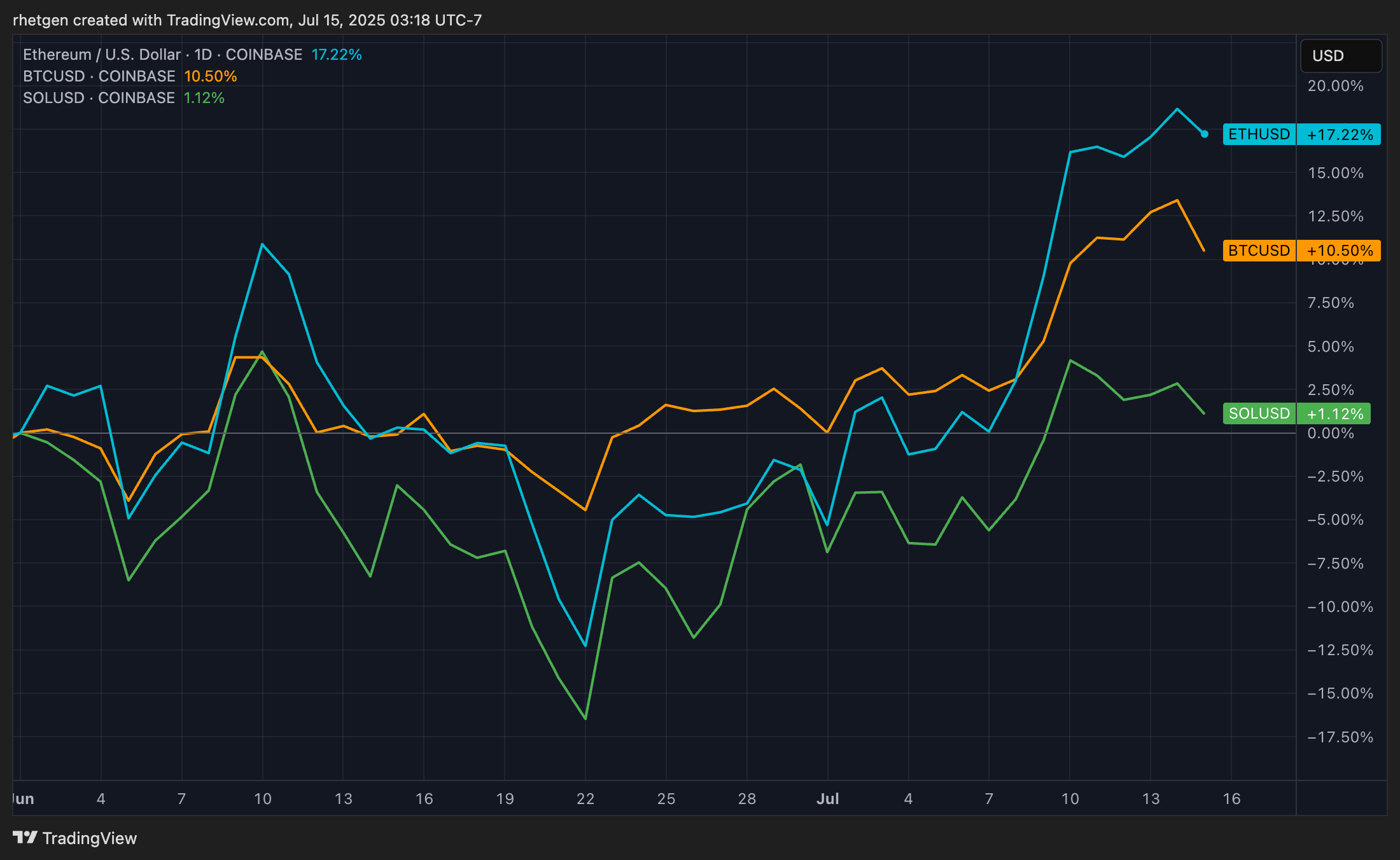 Cryptocurrency is significantly undervalued and poised for substantial growth. It positions ETH as "digital oil," essential for powering the burgeoning digital economy, in contrast to Bitcoin's "digital gold" narrative. Ethereum gained more than BTC and SOL in the month of June. However, it is still underperforming compared to the last bull run in 2021, suggesting that while institutional memory of Ethereum's importance remains, retail enthusiasm has shifted elsewhere.
